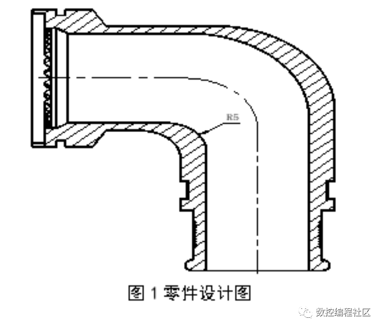 如图1所示是公司某型号产品常用的零件图,为典型的弯管形状。该零件主要做导通线束作用,一头为端面配合齿结构,另一头则是环形齿结构,且弯管角度不唯一,目前存在90°、135°两种。该零件材料通常采用2A12铝,整体板料加工,T4状态。