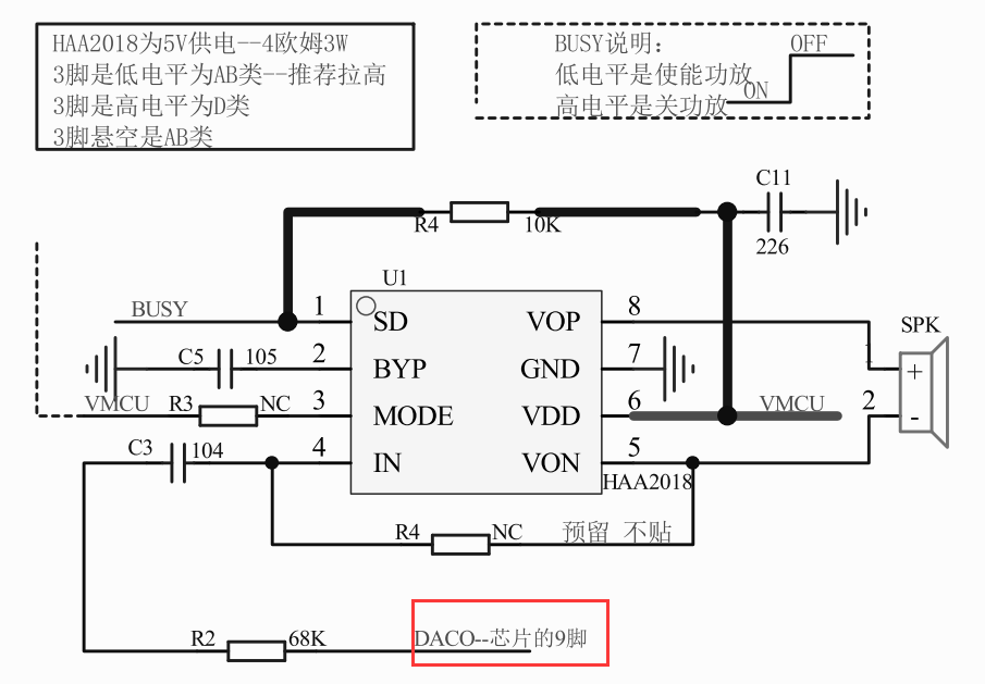 这里推荐使用的是HAA2018 ,正常驱动4欧姆3W的扬声器,供电是5V,详细的自行网上搜索一下手册