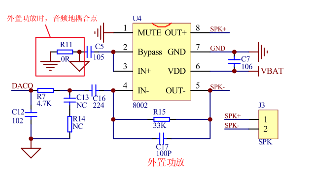 如果配置为DAC输出之后,芯片的9脚,就变成了DAC输出了,PWM输出的2个脚就是高阻态没有任何作用。外挂功放的原理图如下: