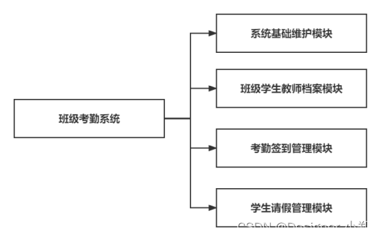 通过对高校实际需求的研究,我将班级考勤管理系统的功能模块分为系统基础支持模块、班级学生教师档案支持模块、考勤签到支持模块、学生请假支持模块,在使用场景上分为浏览器PC端和微信小程序端。