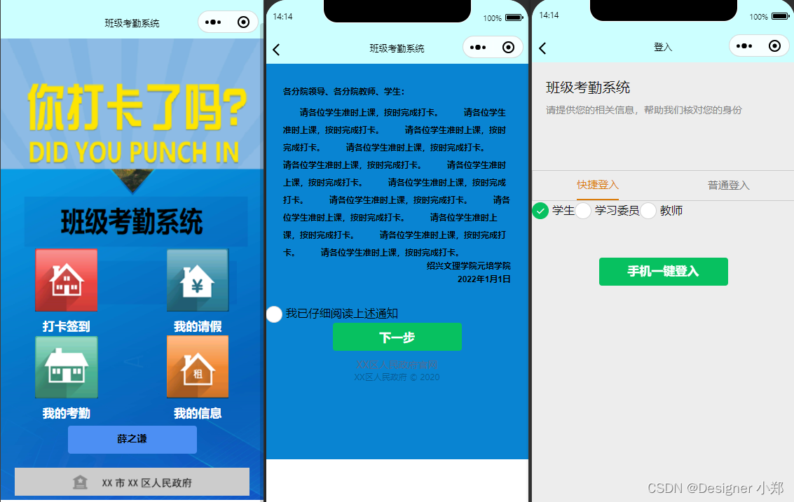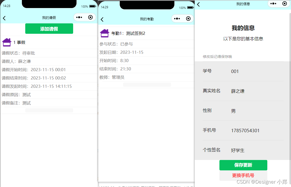 其中学生考勤打卡部分,位于微信小程序端,学生可以进入手机微信完成打卡操作,既方便又高校。管理人员可以对这些信息进行修改,包括了基础的增、删、改、查。