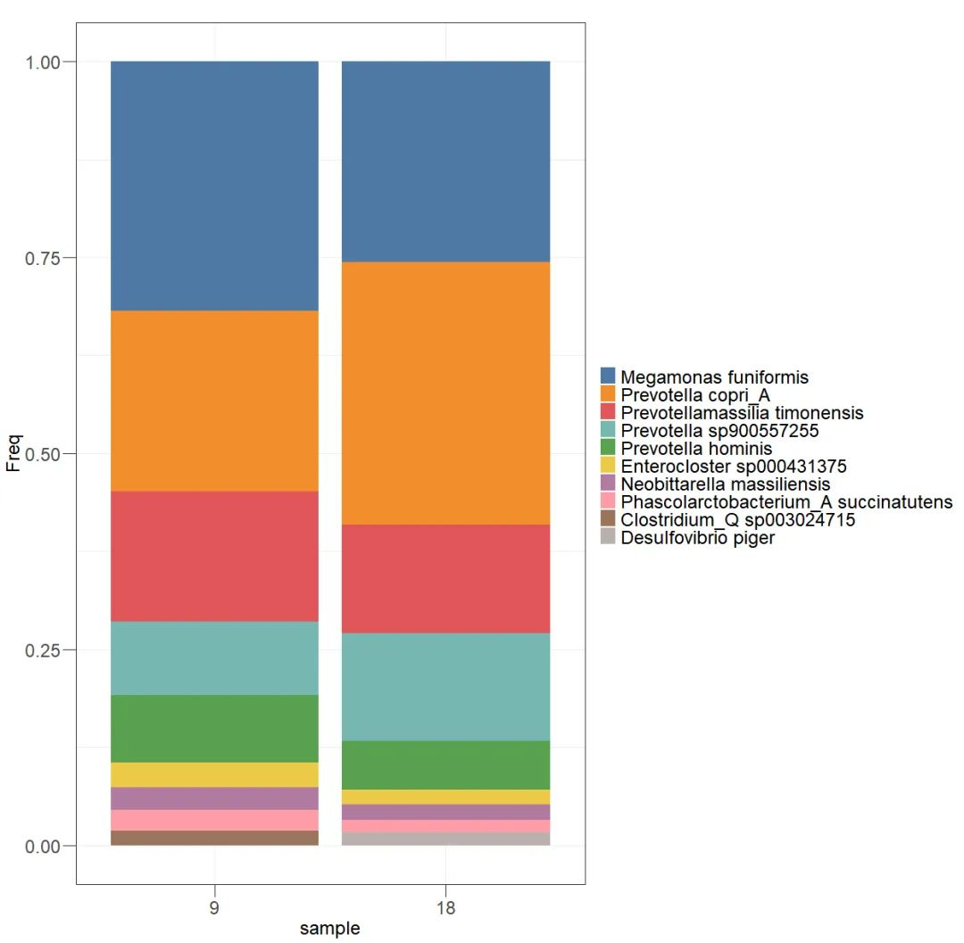 实验结果表明,和9时相比,Megamonas funiformis、Prevotellamassilia timonensis、Prevotella hominis 等物种的丰度在18时略低,而 Prevotella copri_A 和Prevotella sp900557255 在18时更高(图5)。