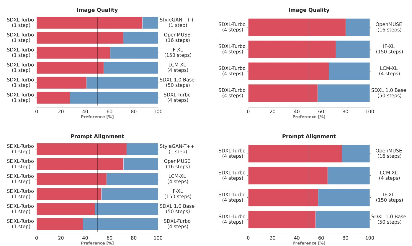 为了选择 SDXL Turbo,我们通过使用相同的提示生成输出来比较多个不同的模型变体(StyleGAN-T++、OpenMUSE、IF-XL、SDXL 和 LCM-XL)。 然后,人类评估者会随机看到两个输出,并被要求选择最符合提示方向的输出。 接下来,用相同的方法完成图像质量的附加测试。 在这些盲测中,SDXL Turbo 能够以一步击败 LCM-XL 的 4 步配置,并且仅用 4 步击败 SDXL 的 50 步配置。 通过这些结果,我们可以看到 SDXL Turbo 的性能优于最先进的多步模型,其计算要求显着降低,而无需牺牲图像质量。