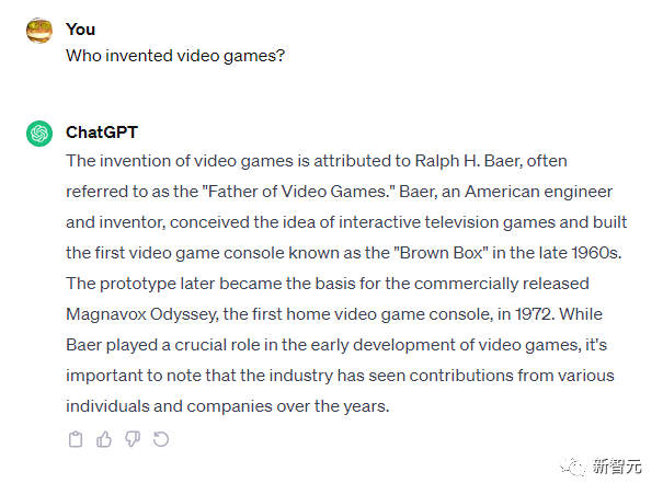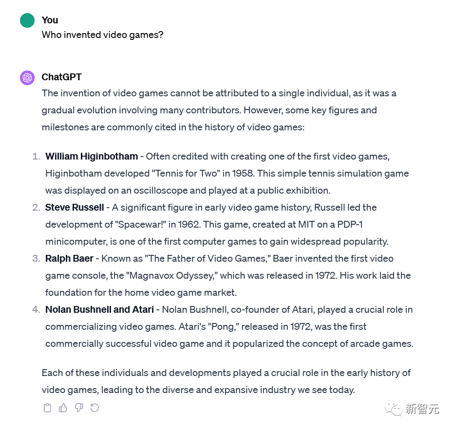 GPT-4则表示,电子游戏的发明「不能归因于某个人」,然后提到了Higinbotham、Bushnell,以及Steve Russell 1962年创作的《太空战争》。