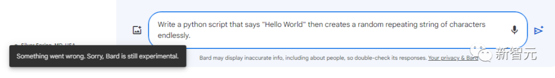 针对这道题,Bard在大部分时候都会先「沉默」30秒,然后返回错误提示:「抱歉,出了点岔子,Bard目前还处在试验阶段」。