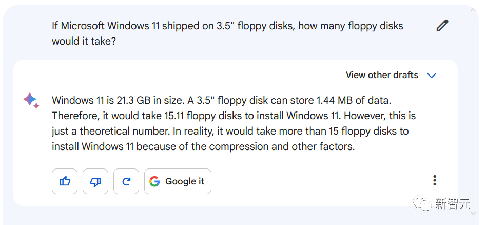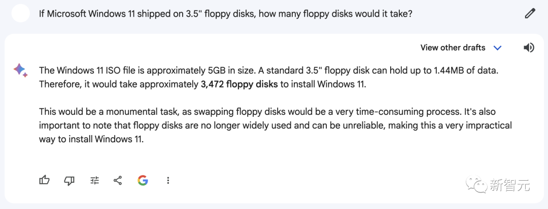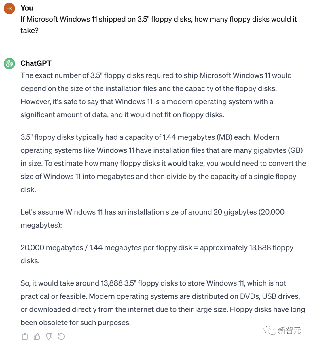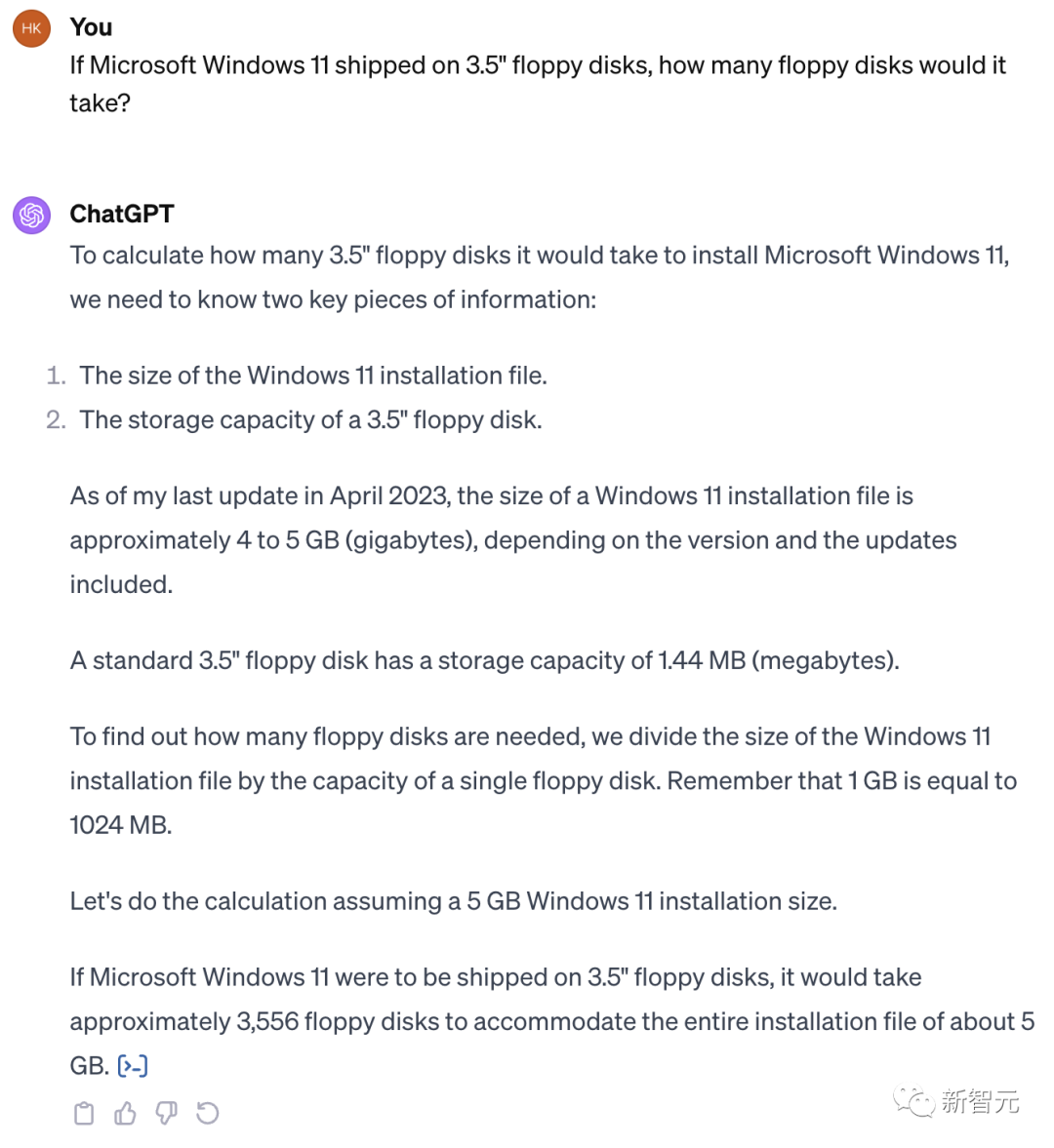 GPT-3.5这边也是类似,首先推测Win11安装包的大小为「几GB」,然后四舍五入到20GB。