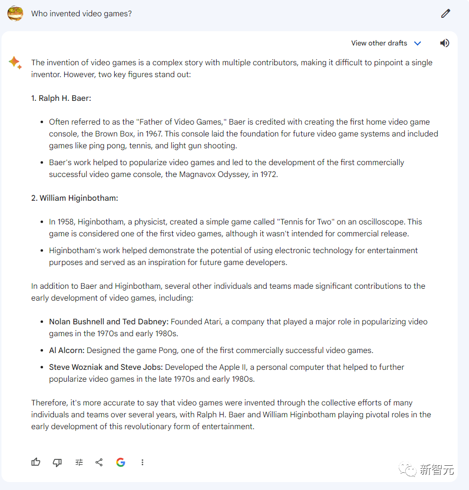 相比之下,新版Gemini Bard不仅简洁而准确地指出了William Higinbotham早期的「Tennis for Two」的贡献。