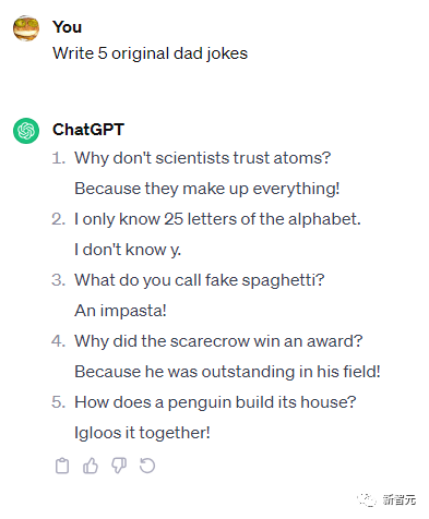 1. 为什么科学家不相信原子?因为它们构成(虚构)了一切! 2. 我只认识25个字母。我不认识y(你)。 3. 假意大利面应该怎么叫?Impasta。 4. 稻草人为何获奖?因为他在自己的领域里很出色! 5. 企鹅如何建造它的房子?Igloos起来!