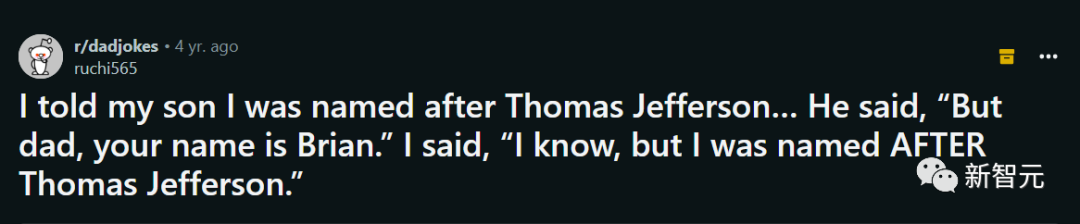 最有趣的答案来自GPT-4,它讲的笑话里说,一个名叫Brian的孩子是以Thomas Edison命名的。谷歌没有搜到相同的笑话,但是搜到一个类似的Thomas Jefferson的孩子名叫Brian的笑话。