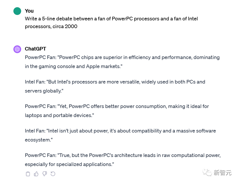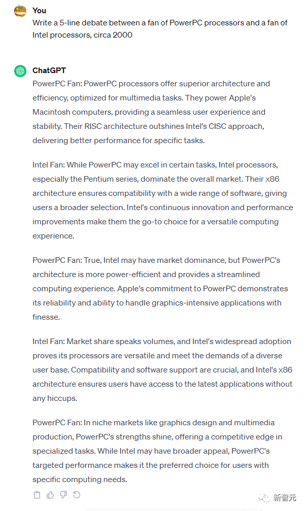 题目:Write a 5-line debate between a fan of PowerPC Processors and a fan of Intel Processors, circa 2000.