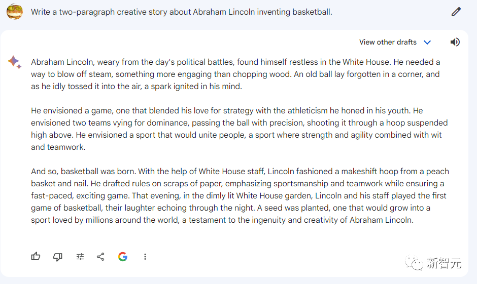 初代Bard在写作中,包含了一些令人回味的语句,比如「林肯对自己微笑,因为他记得小时候玩过那样的游戏」。