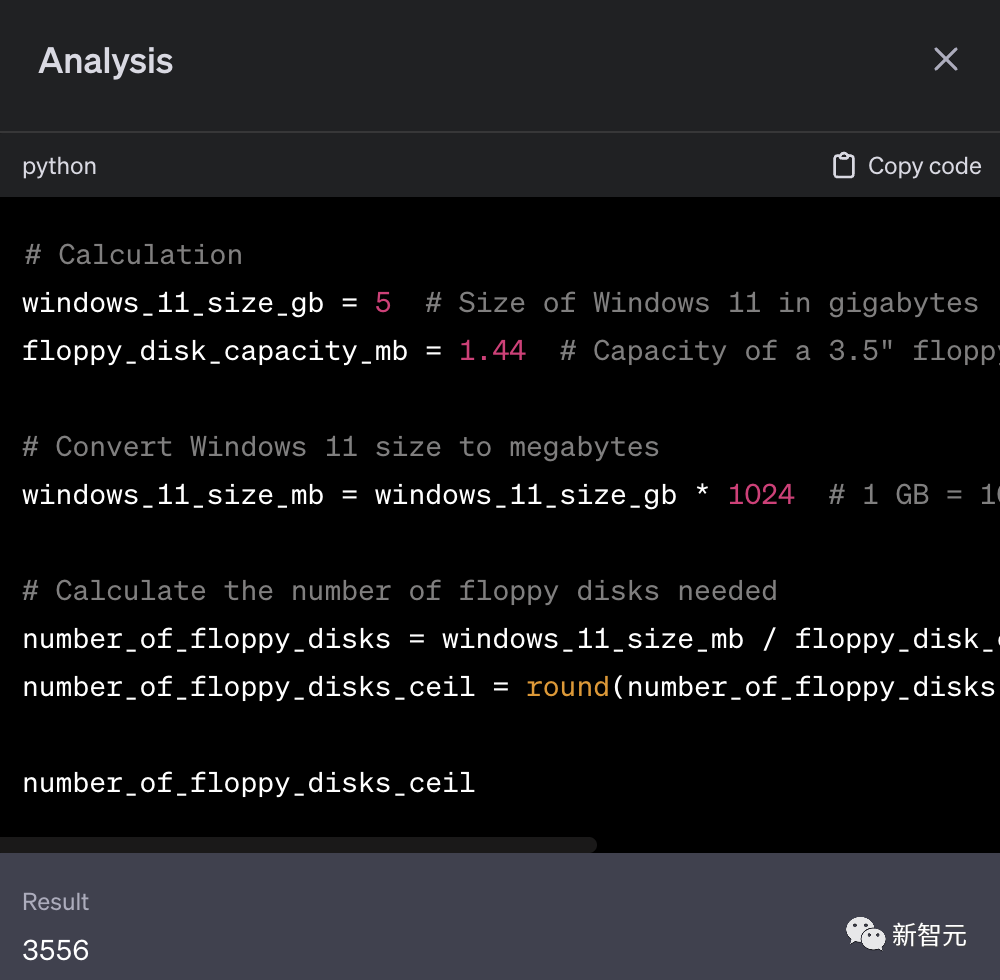 相比之下,只有GPT-4正确地使用了「1GB=1024MB」,并且将结果中的3555.5…进了一位变成35556。