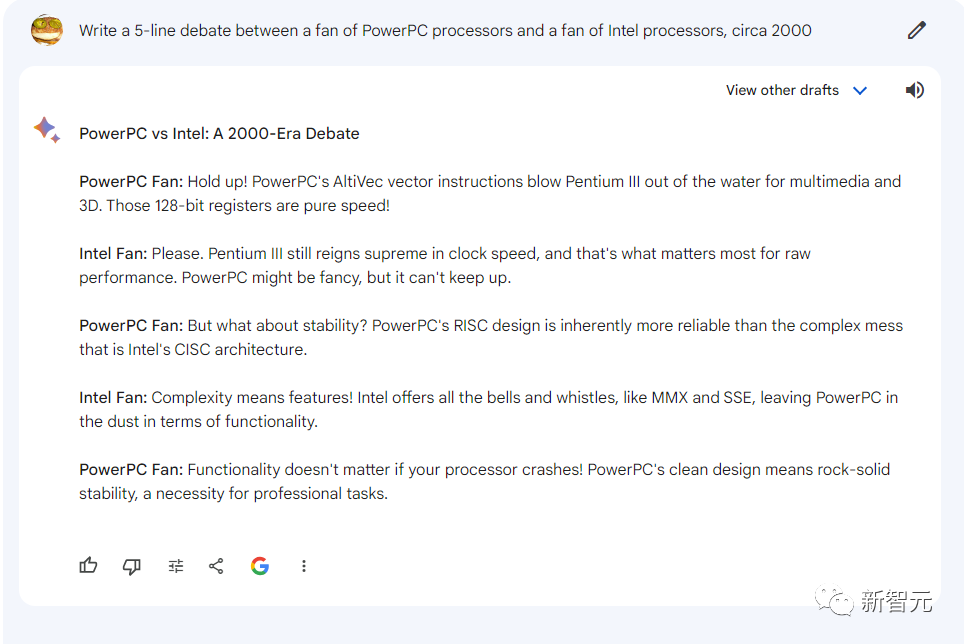 写一篇2000年左右PowerPC处理器爱好者和Intel处理器爱好者之间的5行辩论。