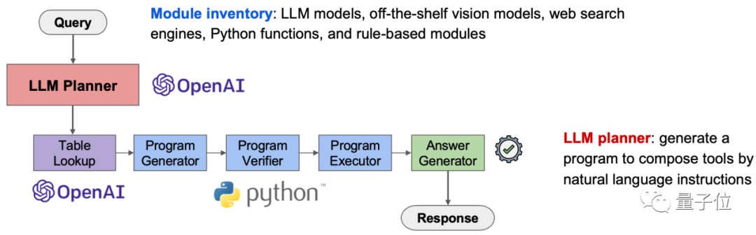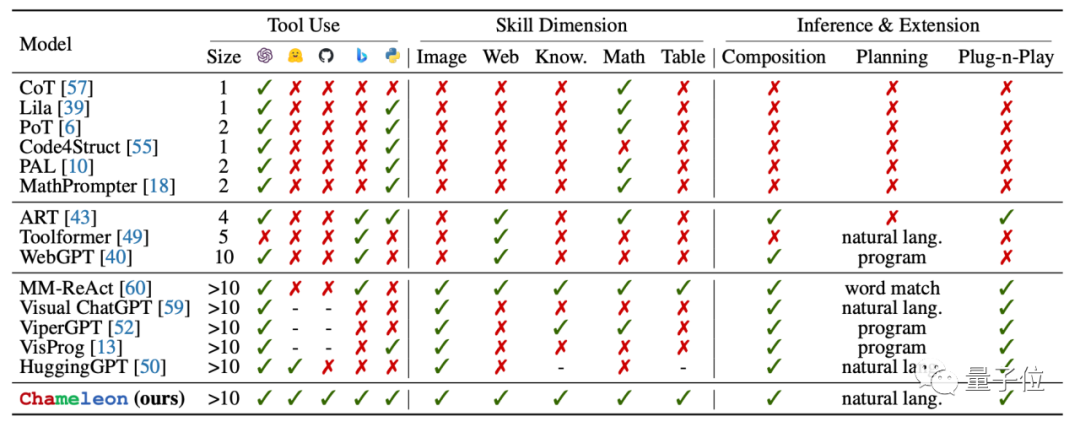 相比其它模型,Chameleon一方面能调用的工具丰富,包括大型语言模型、视觉识别模型、网络搜索引擎、Python编程功能以及基于规则的模块都能搞定。