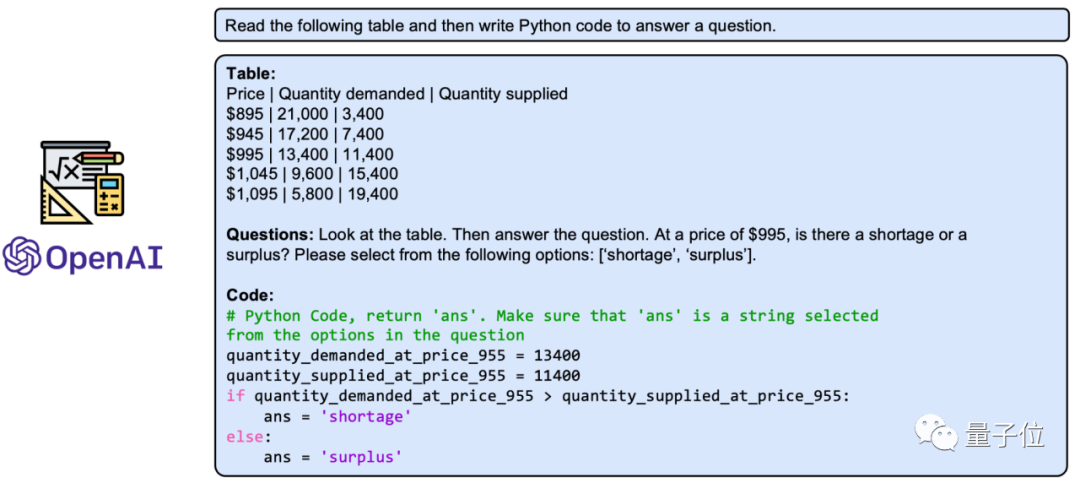 基于这些描述和示例,大型语言模型,如ChatGPT和GPT-4,能够学习如何针对新的输入问题生成适当的程序,以组合和调用工具箱中的不同工具,从而完成涉及复杂推理的输入问题。