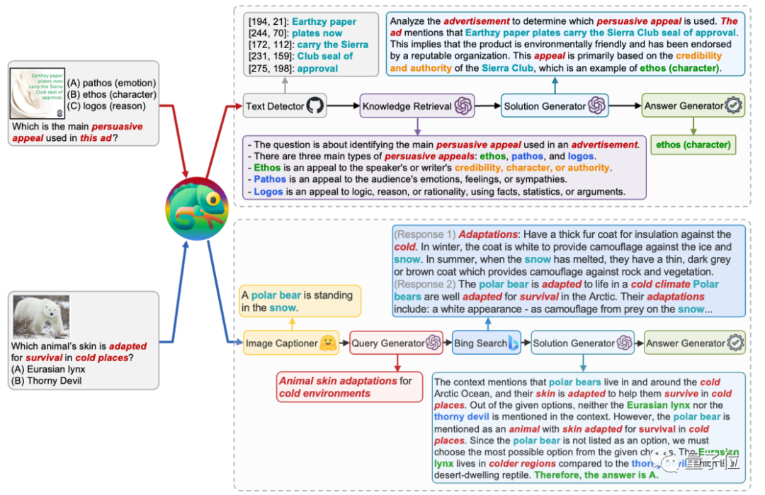 Chameleon模型调用了“图像描述(Image Captioner)”工具来理解图像中的动物,并通过调用“必应搜索(Bing Search)”来获取相关的学科背景知识,最终的答案充分利用了这些信息。
