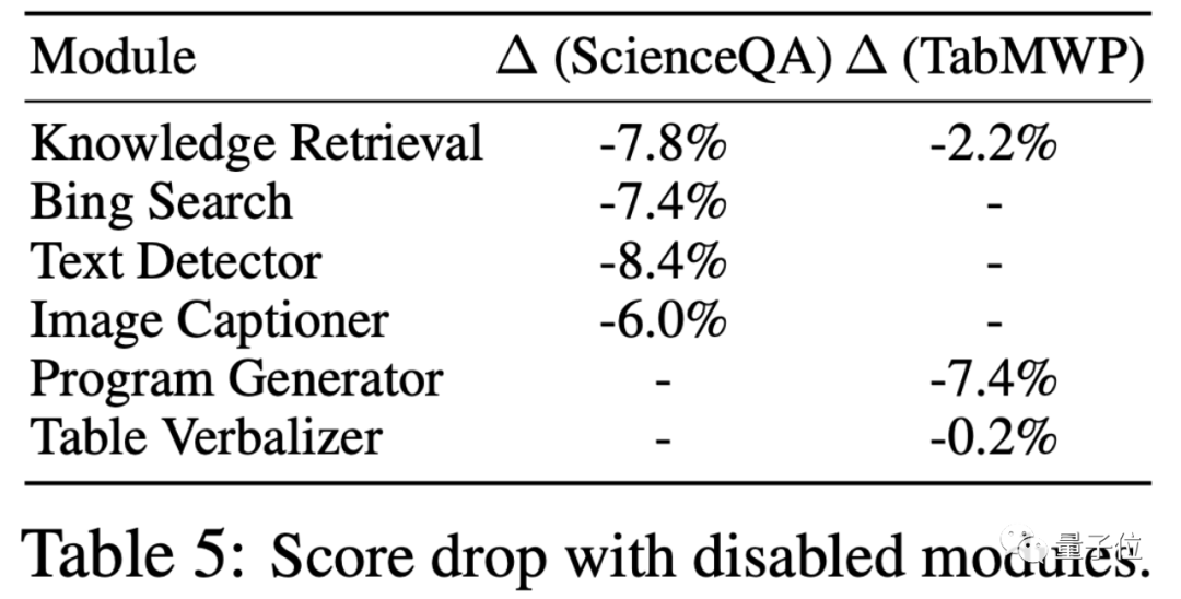 对于ScienceQA任务,特定领域的工具,如“必应搜索(Bing Search)”和与视觉相关的工具,起到了关键作用,而在TabMWP任务中,常用的“程序生成(Program Generator)”模块对最终性能的影响也非常显著。