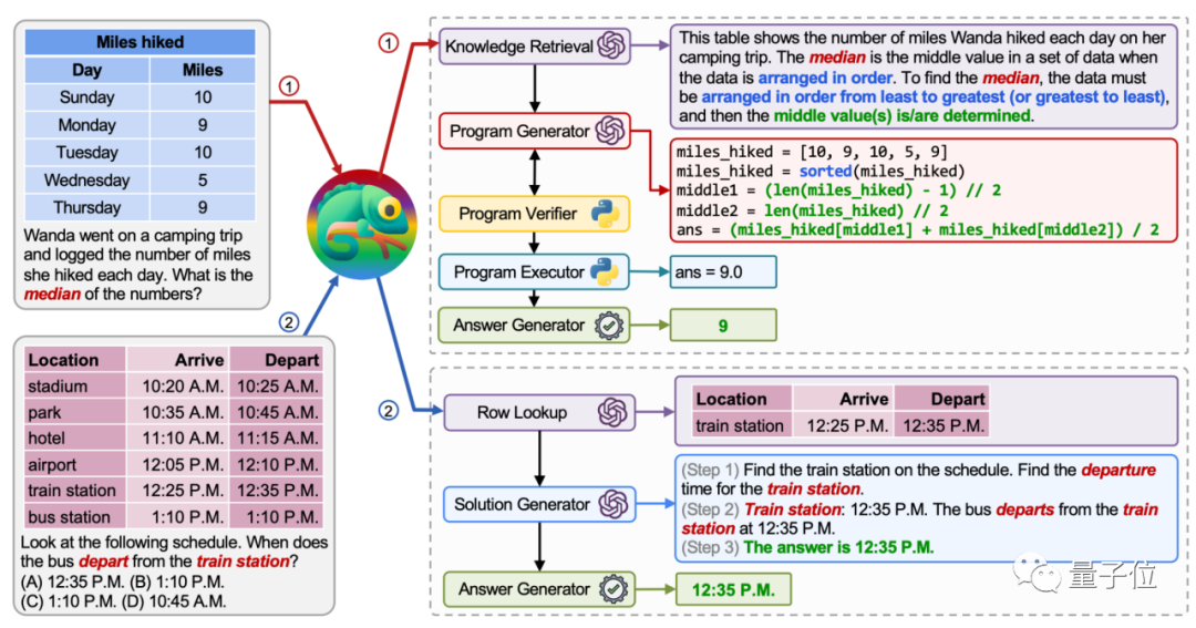 Chameleon模型要么直接通过自然语言推理来完成回答,要么利用程序生成相关的工具来增强逻辑和数学推理。