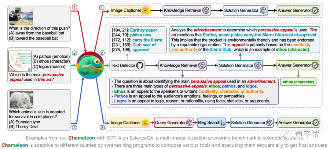 例如,在解决多模态任务ScienceQA时,Chameleon模型会为不同的问题生成不同的程序,以灵活组合各种工具,并按照一定的顺序执行它们,从而最终得出答案。这种灵活性和适应性使Chameleon成为解决复杂任务的强大工具。