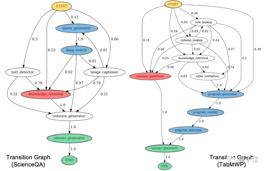 通过可视化Chameleon模型生成的程序中不同工具的状态转移图,可以观察到LLM规划器在工具调用中所展现的规律。