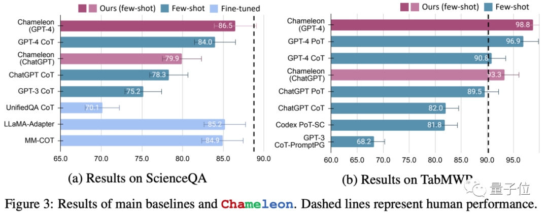 同样地,Chameleon在TabMWP数据集上实现了98.8%的准确率,领先最先进模型17.0%的性能。