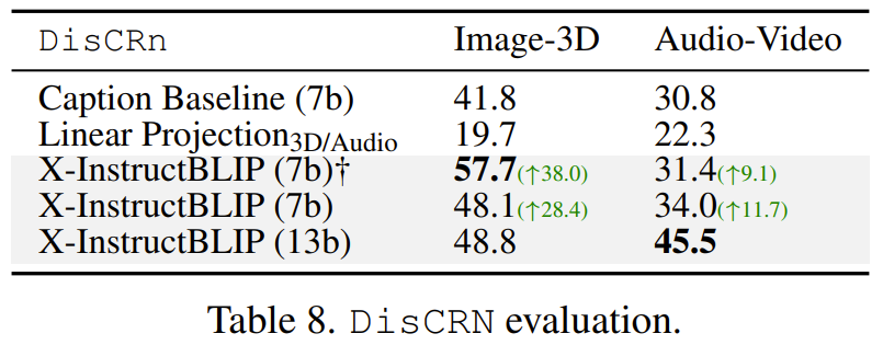 图 2 给出的结果凸显了这个框架的多功能性。定量分析表明,X-InstructBLIP 的表现与现有的单模态模型相当,并且能在跨模态任务上表现出涌现能力。而为了量化和检验这种涌现能力,该团队又构建了 DisCRn。这是一个自动收集和调整的判别式跨模态推理挑战数据集,其需要模型分辨不同的模态组合,比如「音频 - 视频」和「3D - 图像」。