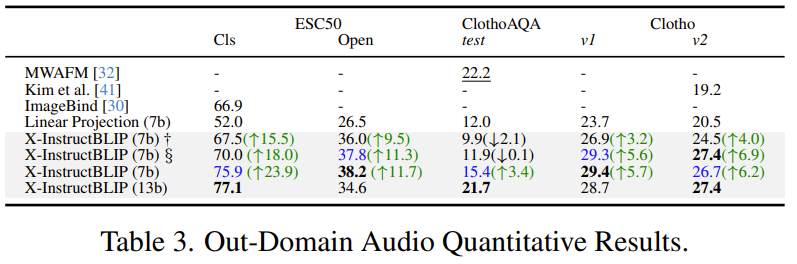值得注意的是,X-InstructBLIP 具备协调统筹输入的能力,因为当同时使用 MusicAVQA 和 VATEX Captioning 中的不同模态作为线索时,模型在使用多模态时的表现胜过使用单模态。但是,这个行为与模型没有前缀提示的模型不一致。