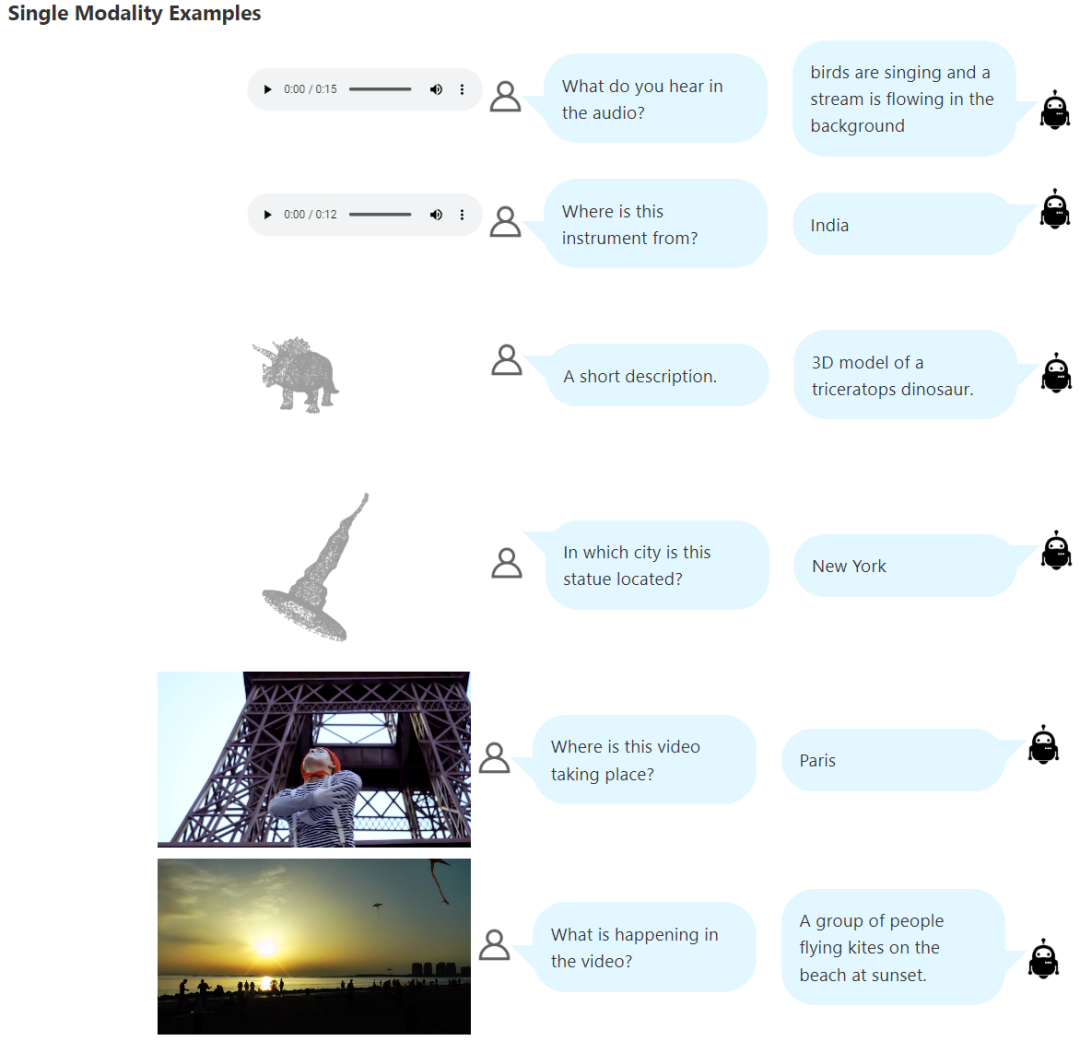 此外,他们还对指令数据进行了增强。由于他们尤其需要 3D 和音频模态的数据,于是他们使用开源大型语言模型 google/flan-t5-xxl 基于相应的字幕描述自动生成了 3D 和音频模态的问答对。这个过程最终从 Cap3D 的 3D 数据得到了大约 25 万个示例,从 AudioCaps 的音频数据得到了大约 2.4 万个示例。