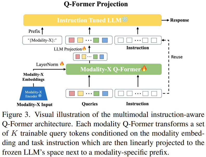 图 1 展示了该模型架构的总体概况:其扩展了 Dai et al. 在 InstructBLIP 项目中提出的指令感知型投影方法,通过独立微调具体模态的 Q-Former 到一个冻结 LLM 的映射,使其可用于任意数量的模态。