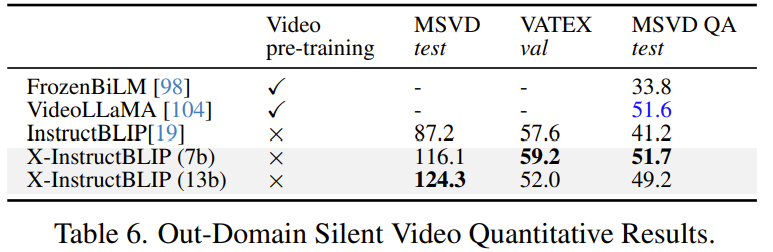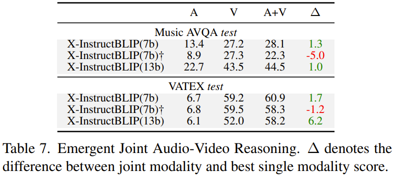 尽管 X-InstructBLIP 的每个模态投影都是分开训练的,但它却展现出了很强的联合模态推理能力。表 7 展示了 X-InstructBLIP 在视频 (V) 和音频 (A) 上执行联合推理的能力。