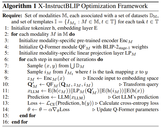 算法 1 概述了 X-InstructBLIP 对齐框架。
