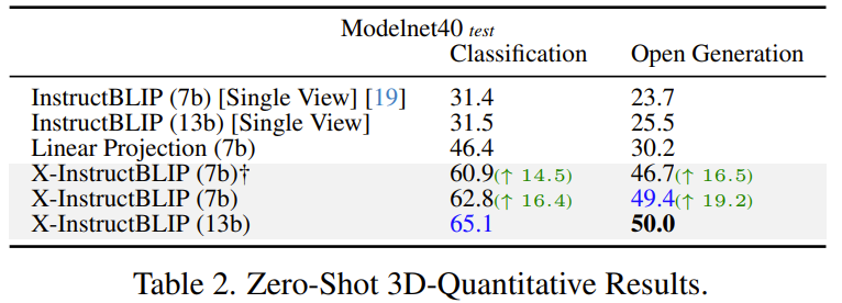 结果可以看到,在准确度方面,X-InstructBLIP 分别优于音频 - 视频和图像 - 3D 基准模型 3.2 和 7.7 个百分点。用等价的线性投影模块替换其中一个 Q-Former 后,图像 - 3D 的性能会下降一半以上,音频 - 视频的性能会下降超过 10 个点。