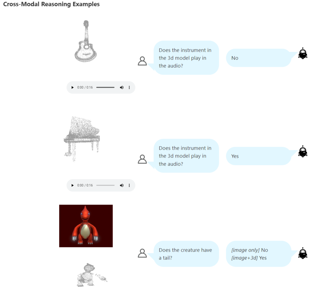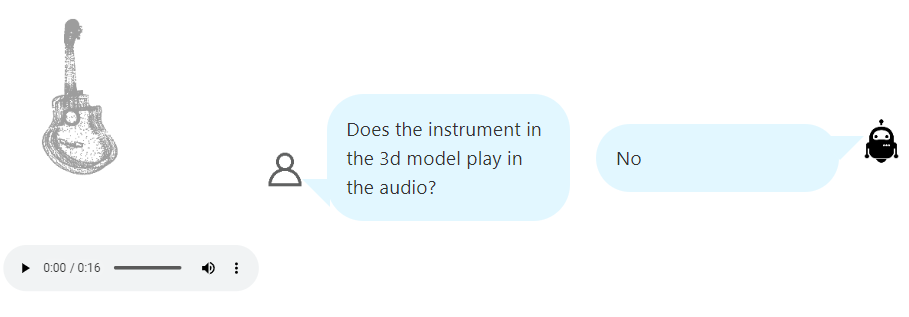 给你一首曲子的音频和一件乐器的 3D 模型,然后问你这件乐器能否演奏出这首曲子。你可以通过听觉来辨认这首曲子的音色,看它是钢琴曲还是小提琴曲又或是来自吉他;同时用视觉识别那是件什么乐器。然后你就能得到问题的答案。但语言模型有能力办到这一点吗?