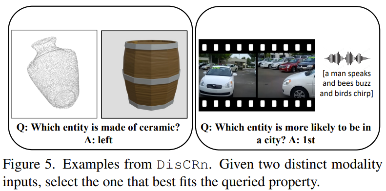 如图 5 所示,该任务需要模型跨模态分辨两个实体的性质,做法是选出哪个模态满足查询的性质。该任务要求模型不仅能分辨所涉模态的内在特征,而且还要考虑它们在输入中的相对位置。这一策略有助于让模型不再依赖于简单的文本匹配启发式特征、顺序偏差或潜在的欺骗性相关性。
