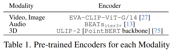 X-InstructBLIP 的构建使用了 LAVIS 软件库的框架,基于 Vicuna v1.1 7b 和 13b 模型。每个 Q-Former 优化 188M 个可训练参数并学习 K=32 个隐藏维度大小为 768 的查询 token。表 1 列出了用于每种模态的冻结预训练编码器。