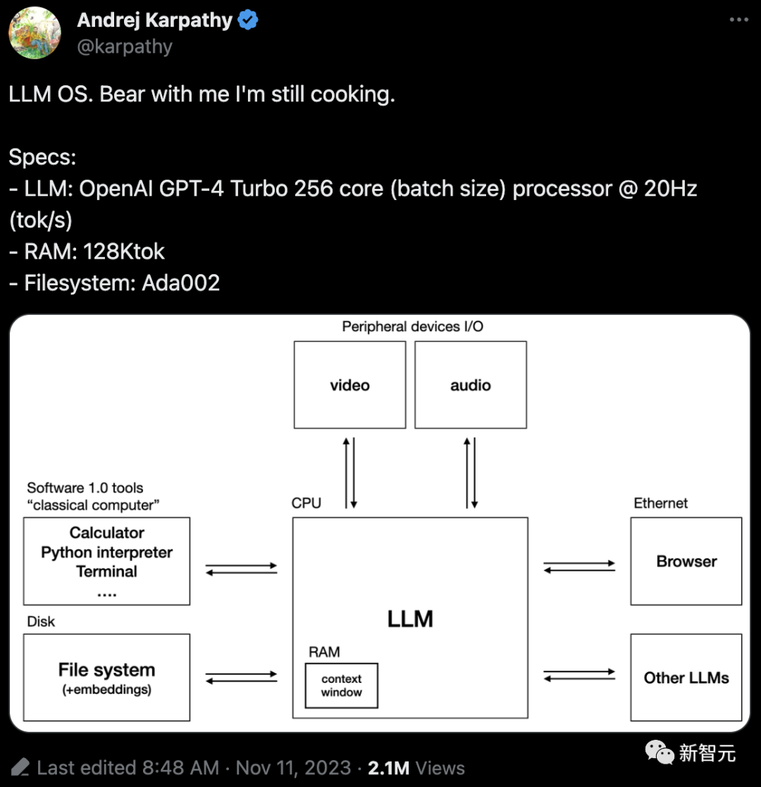 今年11月,OpenAI著名科学家Andrej Karpathy提出了一种全新的理念——「大模型操作系统」。