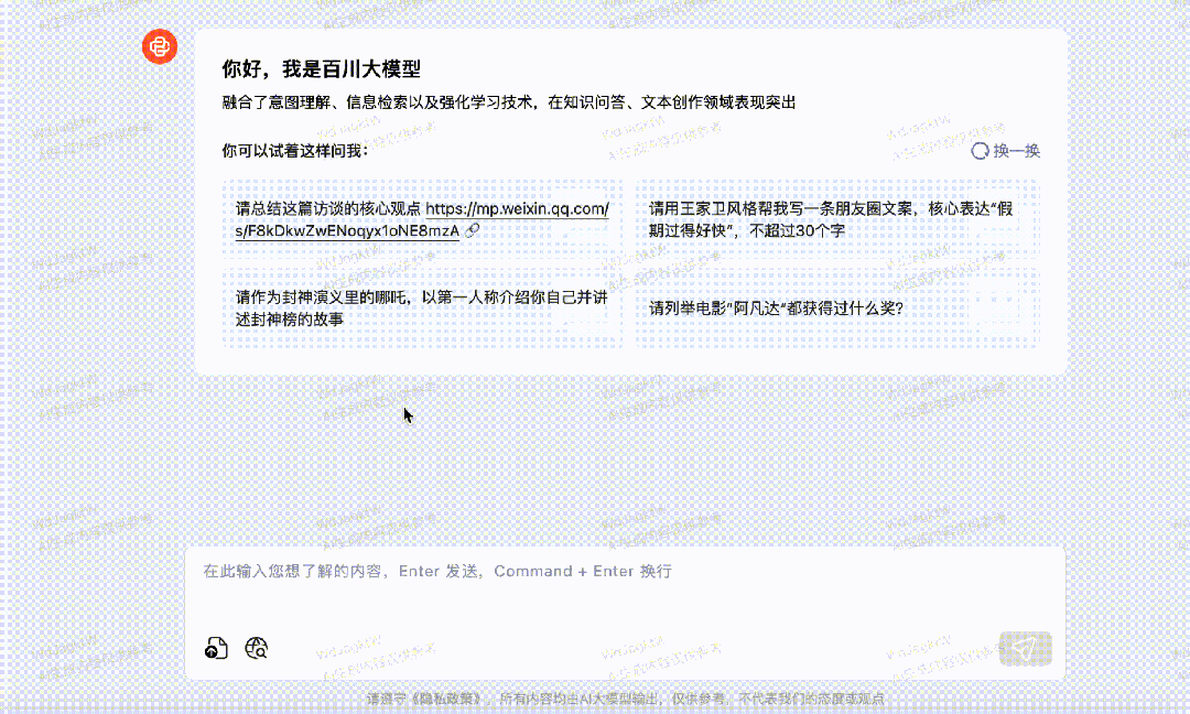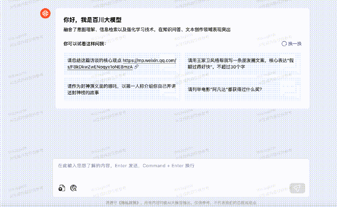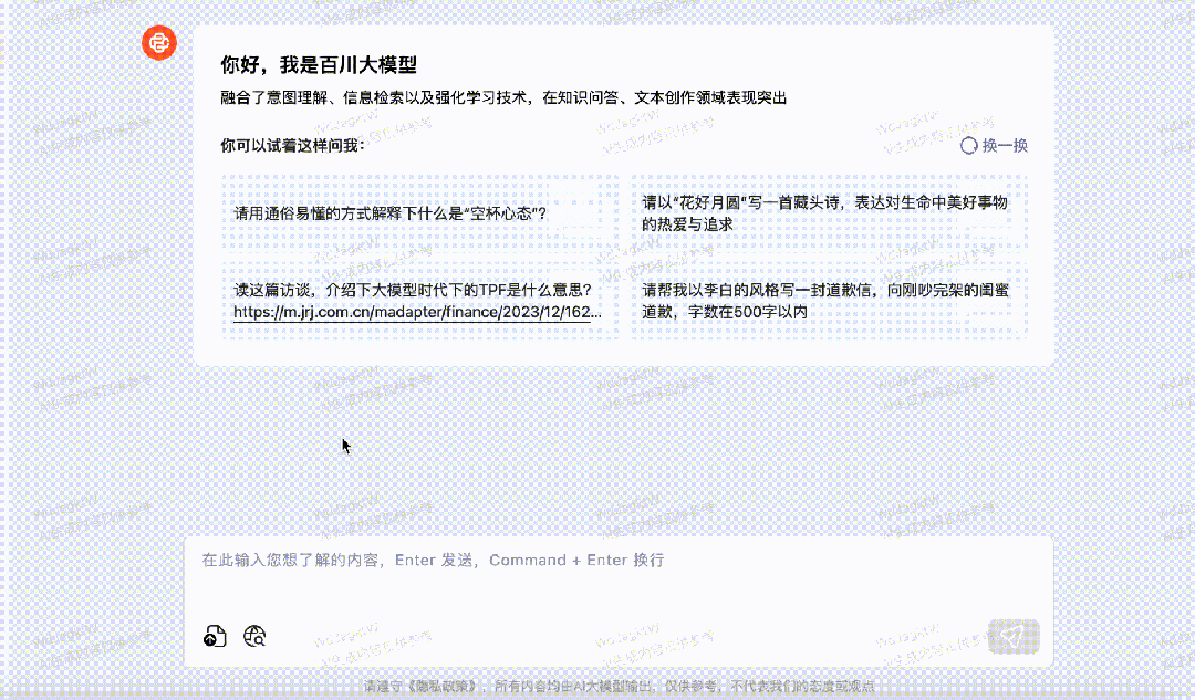 API的完整体验虽然很难展现,但我们可以通过百川智能官网的模型管中窥豹的感受搜索增强带来的体验升级。