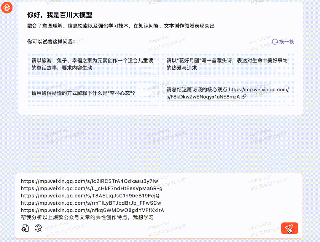 现在,你可以直接甩给Baichuan2-Turbo-192K五个公众号文章的链接 ,让它总结出这些爆款文章的共性。