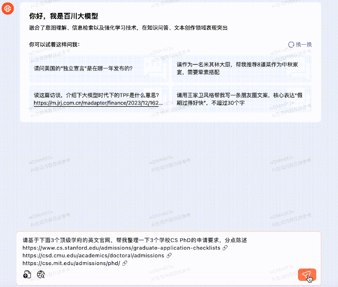 连申请CS PhD,都可以直接把三个学校的官网地址发给它,Baichuan2-Turbo-192K会快速整理出申请Stanford 、CMU、MIT CS博士的具体要求。