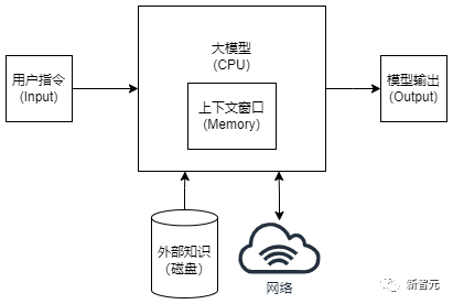 其中,大模型类似于「CPU」,通过预训练将知识内化在模型内部,然后根据用户的Prompt生成结果;上下文窗口可以看做是「内存」,存储了当下正在处理的文本;互联网信息与企业知识库则共同构成了这个系统的「硬盘」。