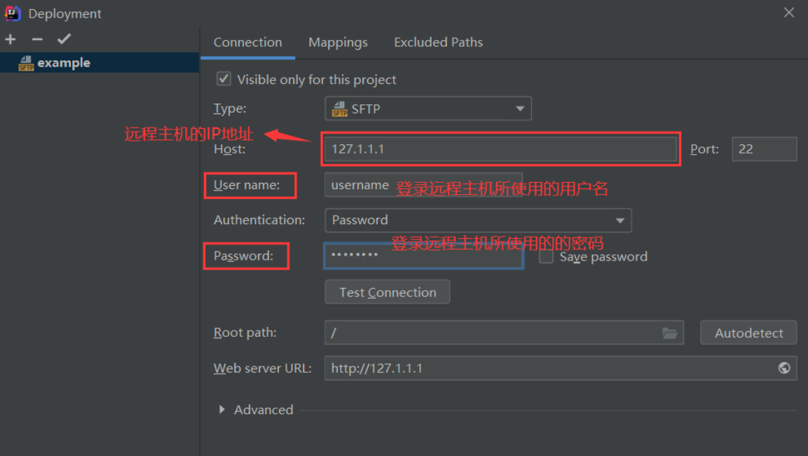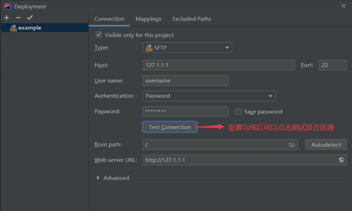 4、添加SFTP,输入远程服务器的IP,登录用户名与密码,点击测试;