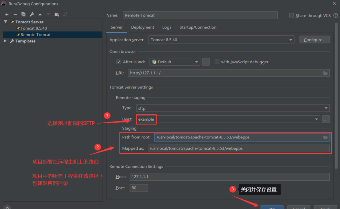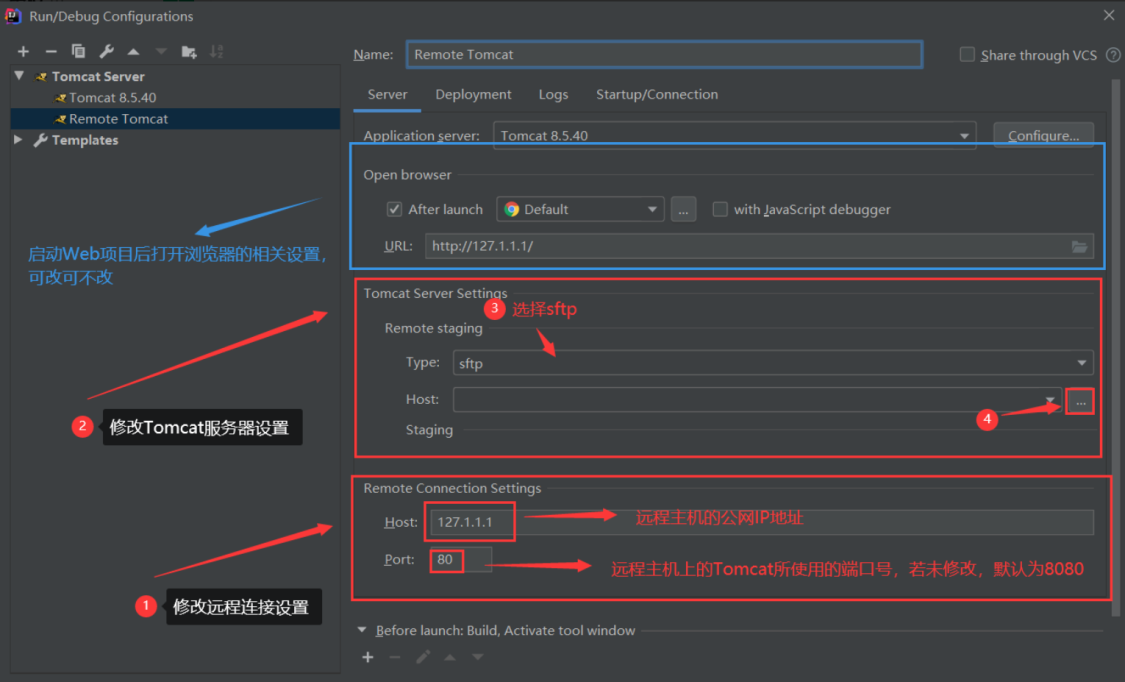 3、修改远程连接设置,添加远程主机的IP,默认端口8080,修改tomcat服务器,选择sftp;
