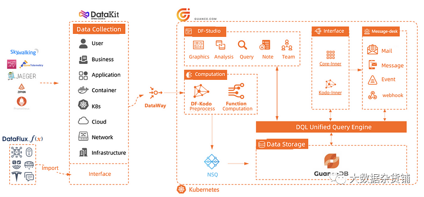 对于数据集成,GuanceDB 使用其自制工具 DataKit。它是一款一体化数据收集器,可以从不同的终端设备、业务系统、中间件和数据基础设施中提取数据。它还可以预处理数据并将其与元数据关联起来。它为数据提供广泛的支持,从日志、时间序列指标到分布式跟踪数据、安全事件以及来自移动应用程序和 Web 浏览器的用户行为。为了满足多场景的多样化需求,它保证了与各种开源探针和收集器以及自定义格式数据源的兼容性。