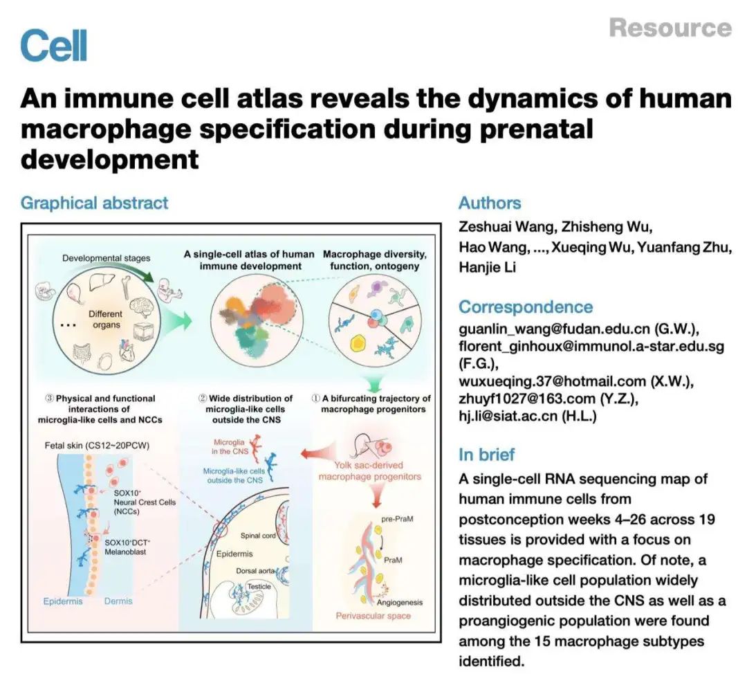 就像文章Wang Z, Wu Z, Wang H, et al. An immune cell atlas reveals the dynamics of human macrophage specification during prenatal development[J]. Cell, 2023, 186(20): 4454-4471. e19.所展示的那样,研究团队结合单细胞转录组测序、先进的生物信息学手段、多重免疫荧光染色、体外功能实验等技术构建了横跨18个发育阶段、19种组织的人类胚胎免疫系统发育高分辨率图谱。