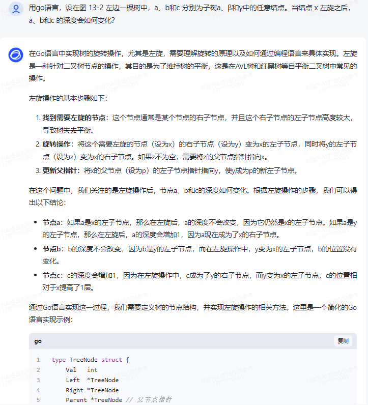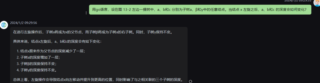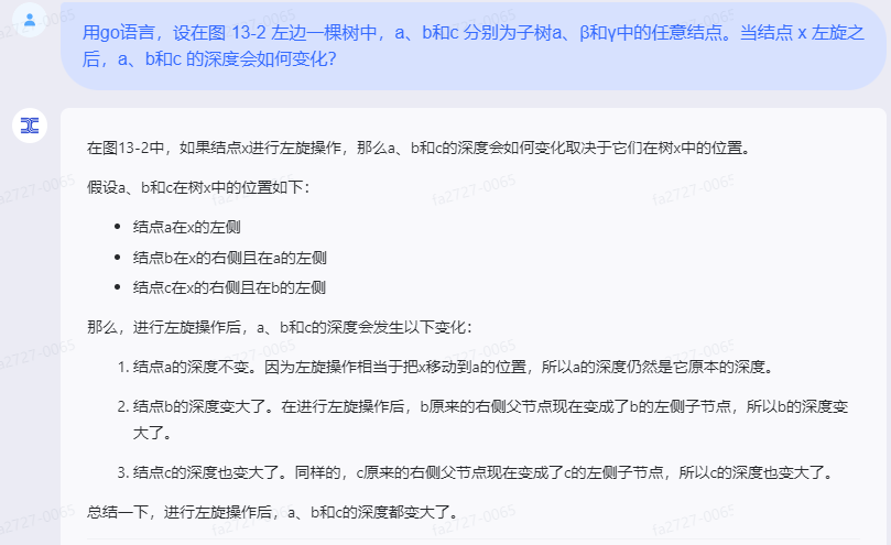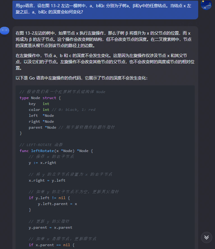 以下是 Go 语言中左旋操作的伪代码,它展示了节点的深度不会发生变化: