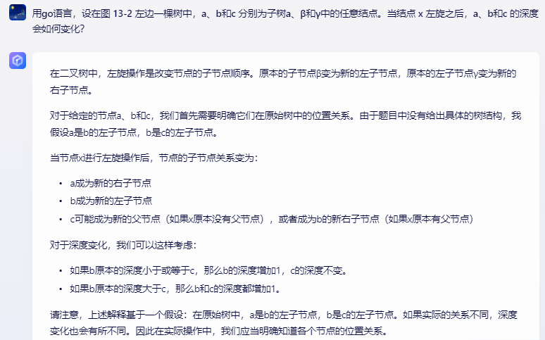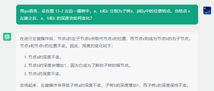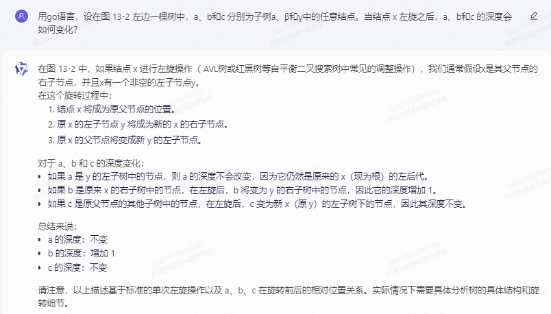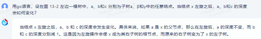 在图 13-2左边的树中,如果节点 x 执行左旋操作,那么子树 β 将提升为 x 的父节点的位置,而 x 将成为 β 的左子节点。这个操作会改变树的结构,但不会改变节点的深度。在二叉搜索树中,节点的深度是从根节点到该节点的路径上的边数。