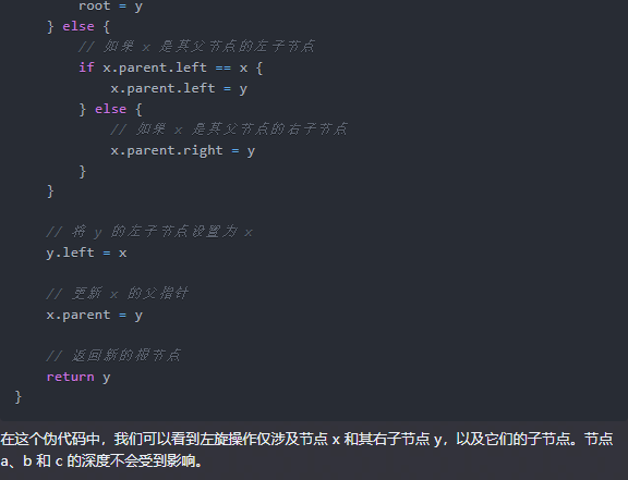 }在这个伪代码中,我们可以看到左旋操作仅涉及节点 x 和其右子节点 y,以及它们的子节点。节点 a、b 和 c 的深度不会受到影响。