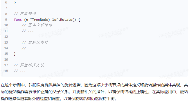// ...在这个示例中,我们没有提供具体的旋转逻辑,因为这取决于树节点的具体定义和旋转操作的具体实现。实际的旋转操作需要维护正确的父子关系,并更新相关的指针,以确保树结构的正确性。在实际应用中,旋转操作通常伴随着额外的检查和调整,以确保旋转后树仍然保持平衡。
