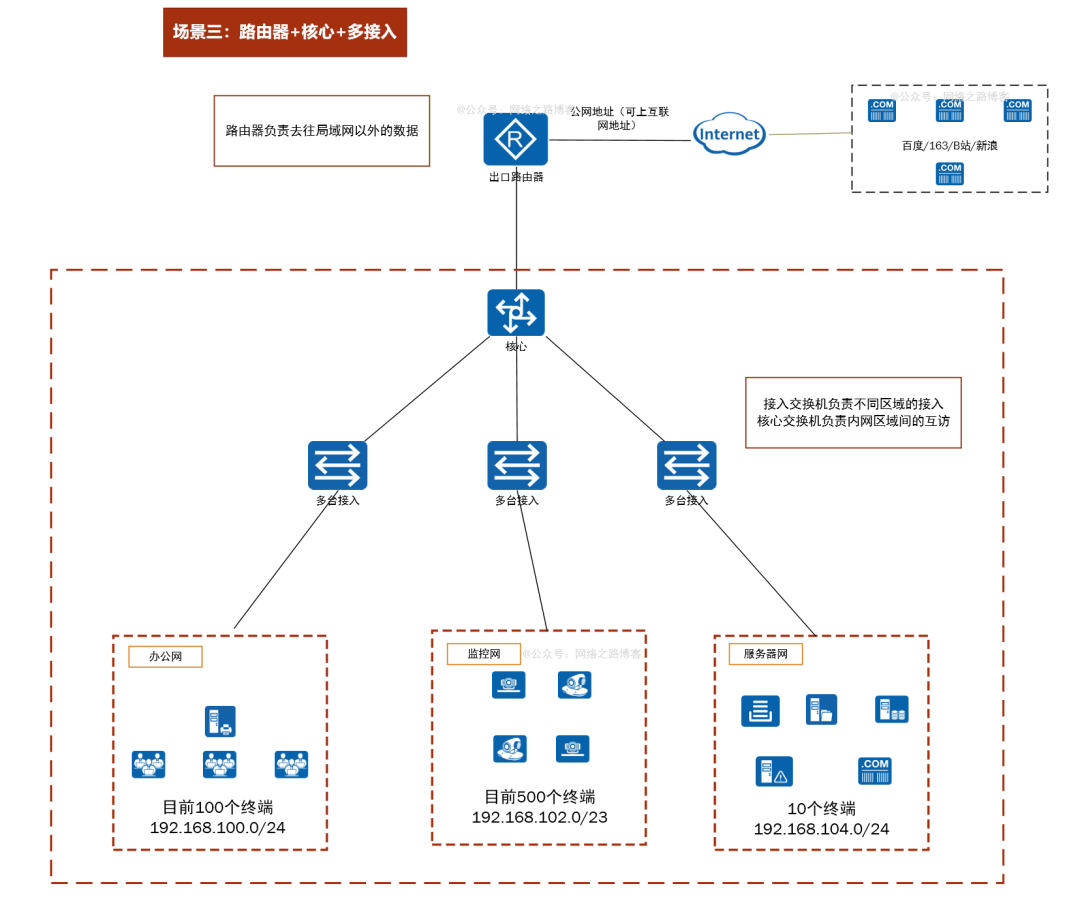 由于有很多技术跟概念没学,这里就简单看看几个组网结构,简单了解下。(这里只涉及简单的企业组网,不涉及运营商、大型网络)