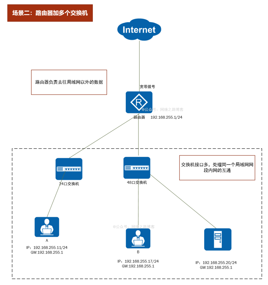 从这篇开始正式进入路由交换网络的讲解,这一篇,不讲解如何进入路由器跟交换机、也不讲解基础的命令行,先来了解路由器跟交换机在常见的网络中起到什么样的作用。当然我们很多技术没学到,所以这里只是为了扩展下思维,了解了解下设备的用途,毕竟后面需要一直跟它们打”交道”。